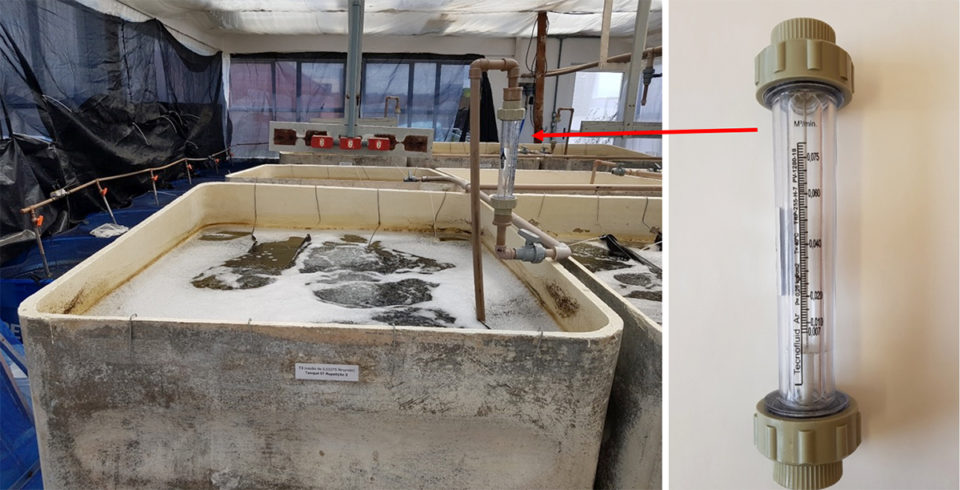 To maintain ammonia at the initial concentration of 7.0 mg/L, ammonium chloride (NH4Cl) was added as needed. The study lasted for 10 days, and had the following treatments: T1 (no aeration); T2 (flow rate 7.5 L/minute); T3 (flow rate 33.75 L/minute); and T4 (flow rate 75 L/minute). To assure the exact air flow rate in all treatments, a commercial rotameter (Tecnofluid® TRP-255-H-7 1 POL NPT) was coupled to the aeration system.