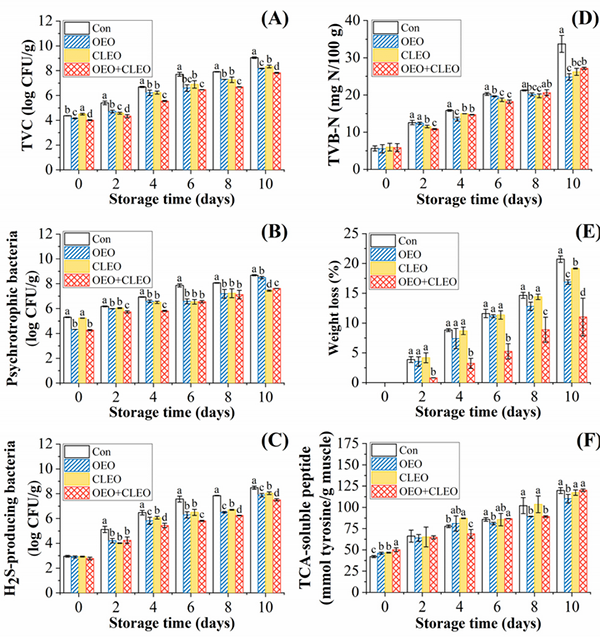 The spoilage of shrimp during refrigerated storage was mainly attributed to the proliferation of psychrotrophic bacteria. During the storage period, the samples treated with essential oils were always lower than the control group, indicating its inhibitory effect on the growth of psychrotrophic bacteria.