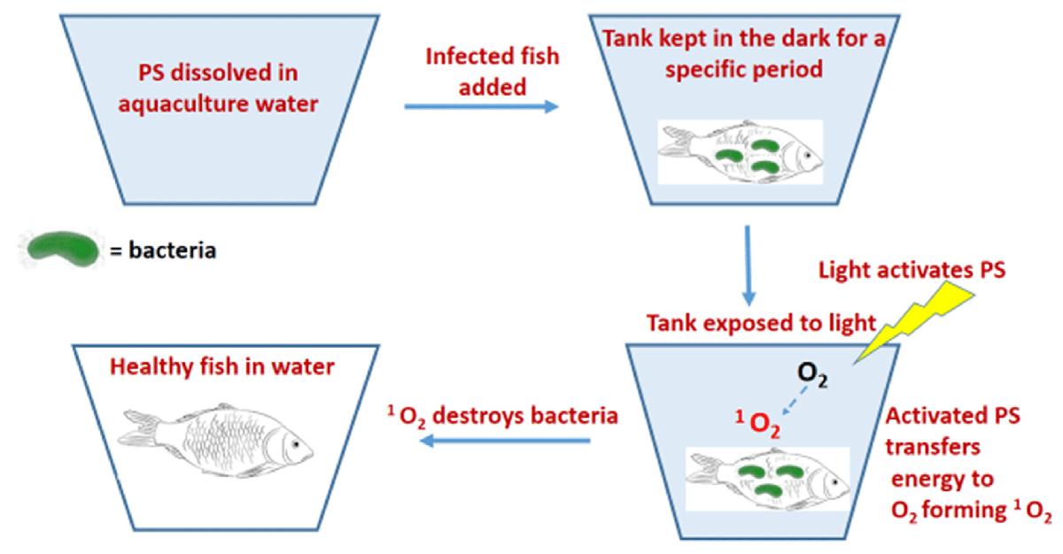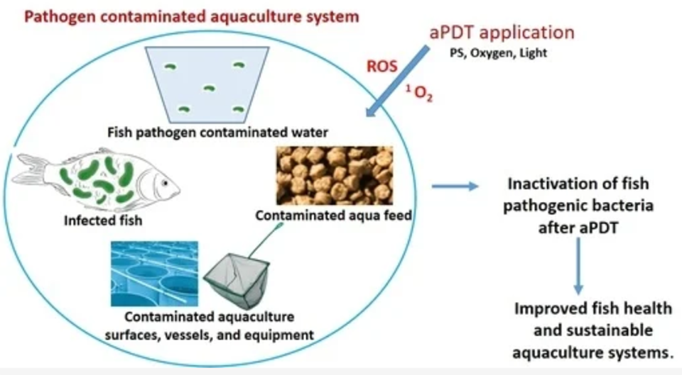 Alternative technologies are needed for controlling pathogenic infections in cultured fish, and Antimicrobial Photodynamic Therapy (aPDT) has recently emerged as one of the technologies that can be successfully applied for the treatment of bacterial diseases and for the prevention of antibiotic resistance. This therapy involves the use of various chemicals called photosensitizing agents, together with light, in an oxygen-rich environment to kill pathogenic bacteria.