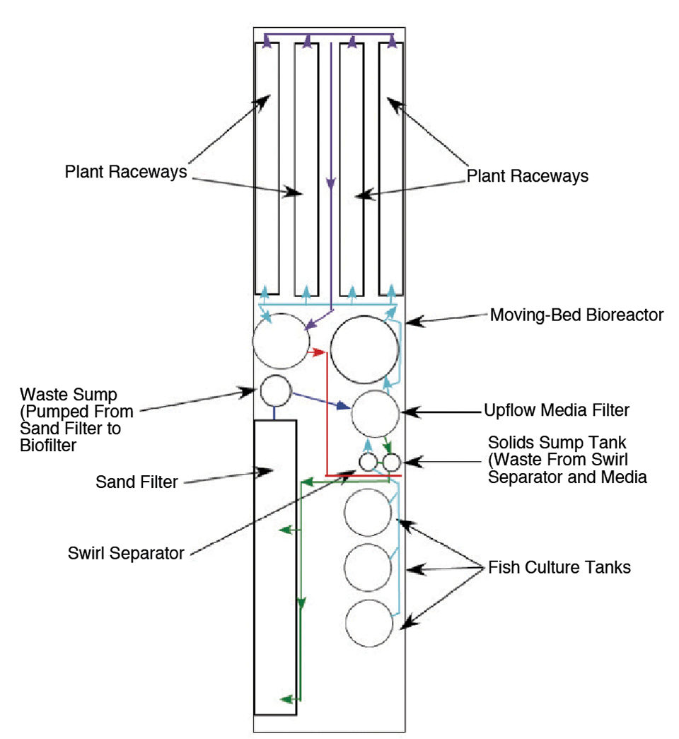 Solids were removed first through a swirl separator then through an upflow media filter for fine solids removal. A moving-bed bioreactor was used to ensure enough nitrification capacity and subsequent fish health.