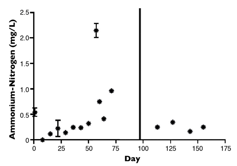 During the first three months, water samples were collected weekly from six points throughout the system and analyzed for ammonium-nitrogen and nitrite-nitrogen. Nitrate-nitrogen was analyzed twice weekly. The ammonium-nitrogen concentration fluctuated during the first 50 days, but remained below 1 mg/L (Figure 2). While there was no change in fish feeding behavior, by day 60, the ammonium-nitrogen level rose above 1 mg/L.