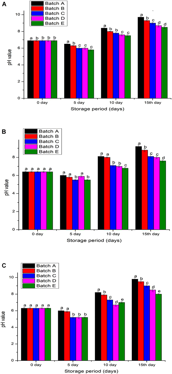 The exposure conditions for chitosan were essential for its chemical stability, particularly to control any underlying microbial enzymatic activities. With the varying pH of 0.1–0.5 in refrigerated conditions, hilsa fish flesh appeared to be slightly acidic with a pH of 6.3 ± 0.9, the lowest compared to pomfret (pH ∼6.3) and shrimp flesh (pH ∼6.9). Within 15 days after the 20 kGy irradiated chitosan coating, the pH of shrimp flesh increased by 23.18 percent, by 18.75 in pomfret, and by 26.98 percent in hilsa fish. Comparatively, without chitosan treatment (control), the pH of shrimp flesh increased by 40.58 percent, by 43.75 percent in pomfret, and by 55.56 percent in hilsa fish.