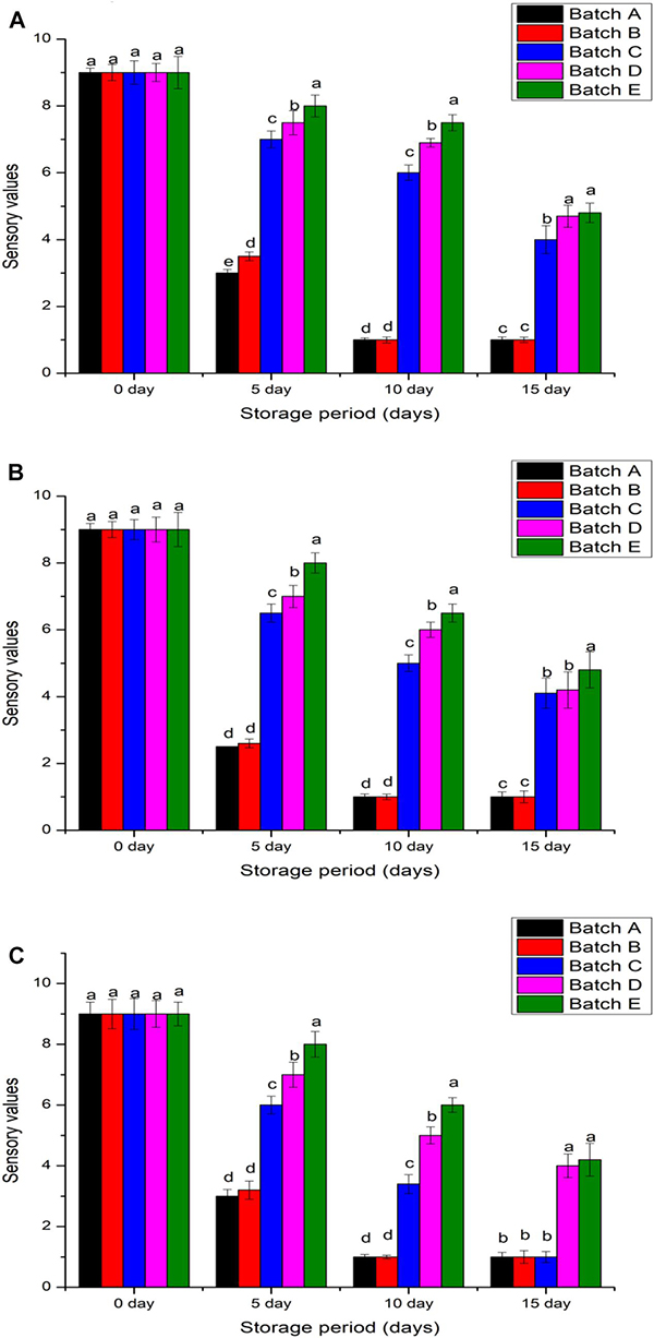 The sensory quality of food products is based on texture, odor, gloss and appeal (non-stale) to achieve customer satisfaction. During refrigeration, the non-treated and acetic acid-treated flesh changed their color from gray to gray-white with an odor score that immediately reduced and ranged 4.71 to 4.92 in five days before greatly reducing to <1.0 in 15 days. It was different for hilsa fish, shrimp and pomfret that received the chitosan coat because after five days, their odor scores were 6.39 to 6.63 and the score only reduced to 5.04 (for 20 kGy irradiated chitosan) and 4.83 (for 10 kGy irradiated chitosan) within 15 days of refrigeration. It is understood that refrigeration alone is ineffective after five days because microbial action to decay the flesh will produce a putrid odor. However, adding a preservative such as (non- or irradiated) chitosan is sufficiently promising to delay the decay of flesh and this maintains their odor score above five, which is the baseline score for safe-to-consume shrimp and fish.