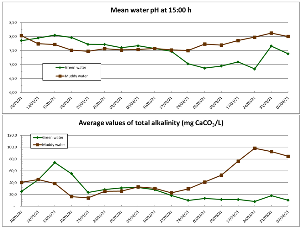 Total alkalinity was managed to keep it above 30 mg CaCO3 per liter with the addition of hydrated lime as needed. In the last 8 weeks, water exchange was intense in the green water tanks, causing the average total alkalinity value to fall just below 20 ppm. At the same time, average total alkalinity increased in the muddy water tanks, mainly in response to the increase in total ammonia. Ammonia is, chemically, a base and thus it is titrated in the alkalinity test (Fig. 2b).