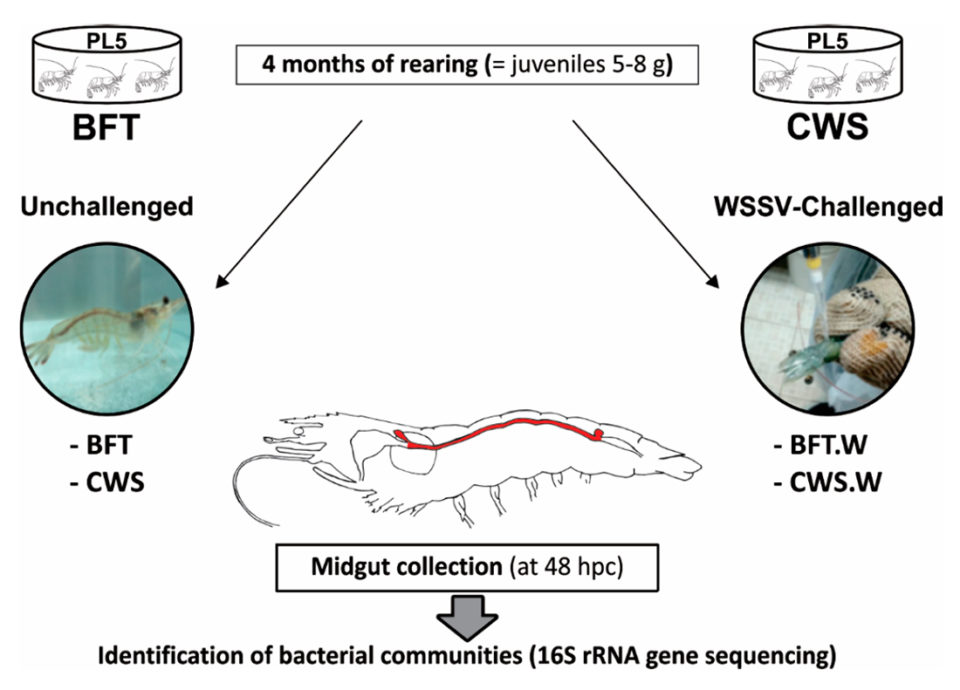 Hasta donde sabemos, solo un informe sobre la descripción de las comunidades bacterianas intestinales de una especie de peneidos – el camarón azul del Pacífico (Litopenaeus stylirostris) – cultivado en un sistema BFT está disponible en la literatura. Además, no se sabe nada acerca de la plasticidad del bacterioma (un órgano especializado con células especializadas que proporciona refugio y nutrientes a las bacterias mientras protege al animal huésped) en los camarones infectados por el WSSV, uno de los patógenos más importantes en el cultivo de camarones.