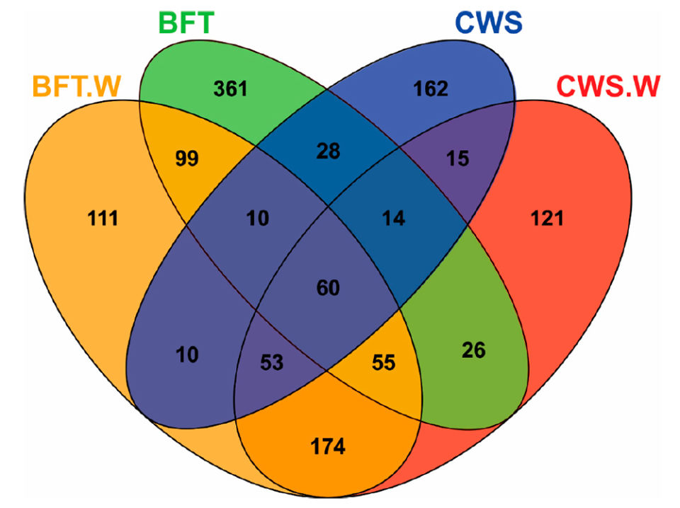 El análisis de los diagramas de Venn [que muestran todas las relaciones lógicas posibles entre una colección finita de diferentes conjuntos] reveló diferencias significativas en la distribución de frecuencias de las unidades taxonómicas operativas bacterianas (OTU; definición operativa utilizada para clasificar grupos de individuos estrechamente relacionados) de acuerdo con el sistema de cultivo (BFT y CWS) y desafío viral (Fig. 2). El intestino medio de los animales cultivados en BFT exhibió un mayor número de OTU en comparación con los de CWS. Quinientos setenta y un OTU se encontraron exclusivamente en camarones criados en bioflocs (361 en BFT, 111 en BFT.W y 99 en ambos grupos), mientras que 298 OTU eran exclusivos de camarones criados en agua de mar clara (162 en CWS, 121 en CWS.W y 15 en ambas condiciones).
