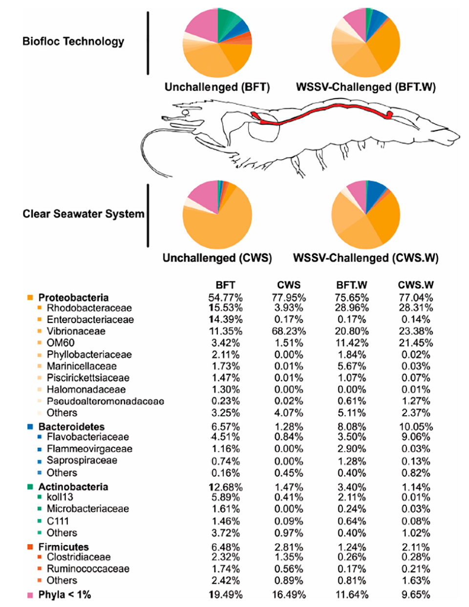 La composición bacteriana del intestino medio de los camarones criados en bioflocs era más rica y diversa que la del agua de mar clara. El grupo bacteriano predominante pertenecía al filo Proteobacteria (Rhodobacteraceae, Enterobacteriaceae y Vibrionacea), seguido del phylum Bacteroidetes (Flavobacteriaceae), Actinobacteria y Firmicutes. Vibrionaceae fue más abundante en el grupo CWS que en los camarones criados con BFT (68.23 por ciento y 11.35 por ciento de las comunidades bacterianas totales, respectivamente).