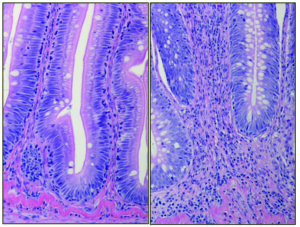 Fig. 1 shows histological slides of distal intestine. The left image shows a grade 2 sample, while the other reflects grade 4. In the grade 4 photo, note the increased inflammation, as well as expansion of lamina propria, both between and below the crypts. There are also a loss of supranuclear vacuoles in epithelial cells and an increased number of goblet cells in the epithelium.