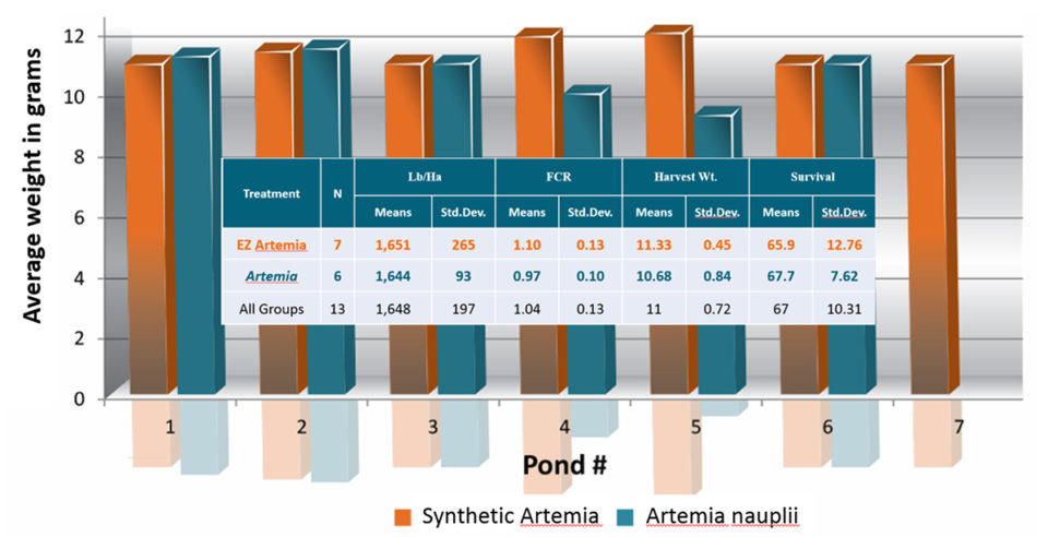 To test if PLs produced with synthetic artemia have the same quality as PLs produced with real, live artemia, trials were conducted to compare pond results at a Latin American shrimp farm using PLs produced with hatched artemia cysts and with synthetic artemia.