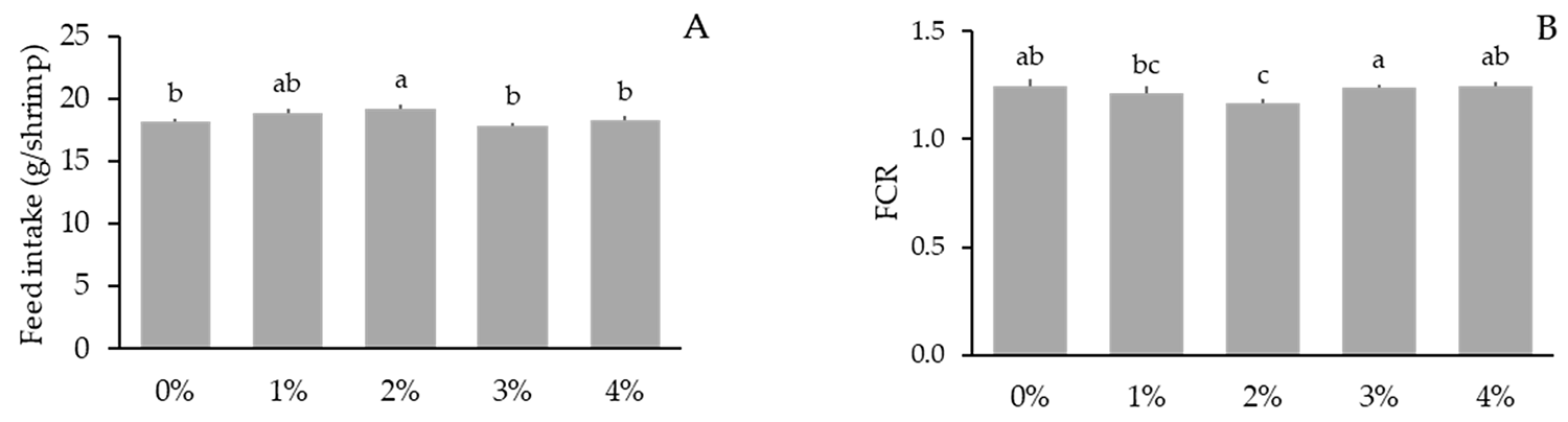 There is a limited body of recent literature exploring the inclusion of mussel meal as a potential ingredient in shrimp diets, highlighting a significant information gap that can be studied. In our research, we identified that the inclusion of small amounts of mussel meal in the diet of L. vannamei shrimp can potentially improve their production performance.