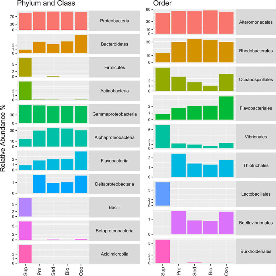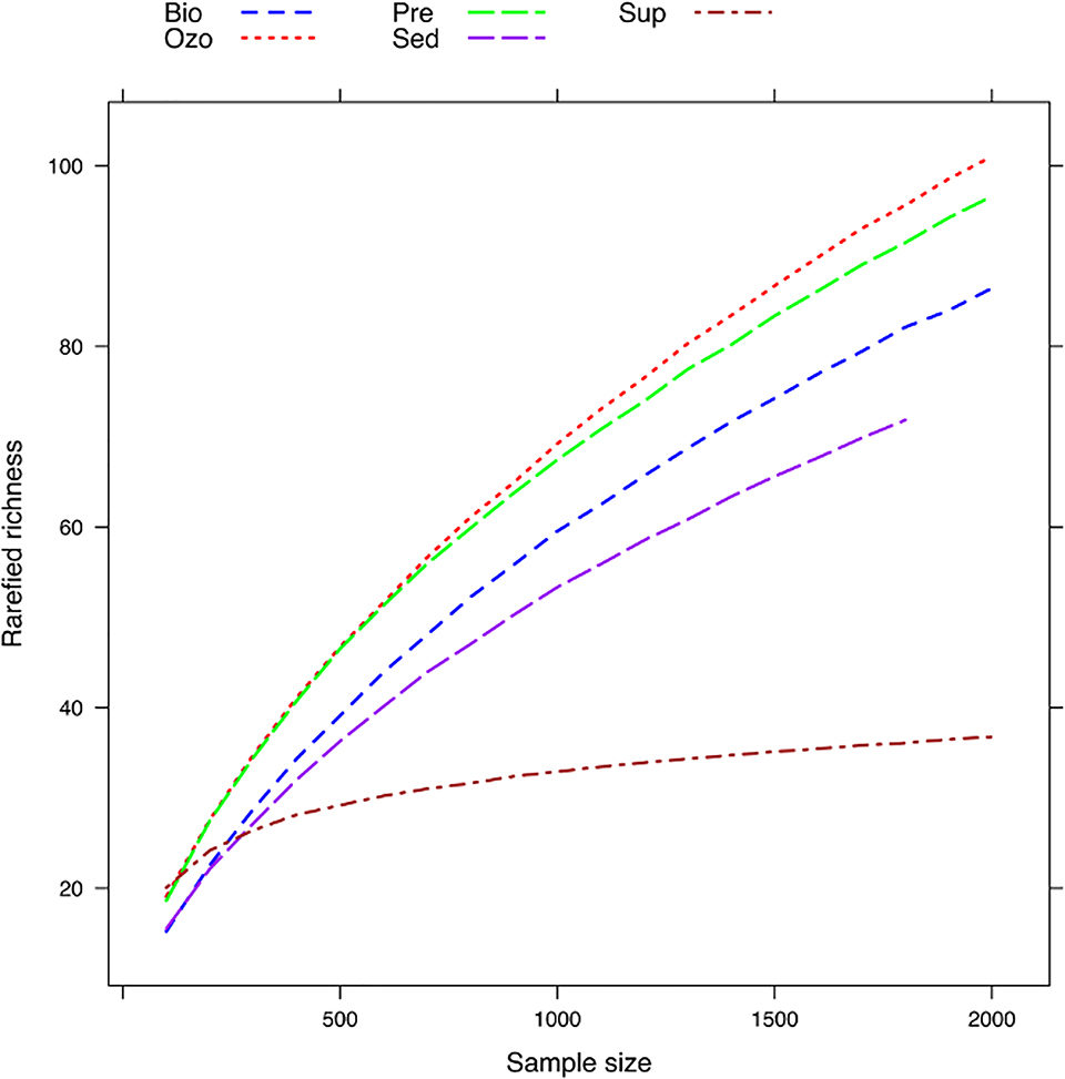 To examine changes in bacterial richness, rarefaction curves (technique to assess species richness for a given number of individual samples) were generated for all compartments (Fig. 1). Controlling for sampling size, operational taxonomic unit (OTU; an operational definition used to classify groups of closely related individuals) richness in the Sup compartment was 35.79 ± 1.02. In the aquaculture tanks, richness was lowest in Sed (69.84 ± 1.74) and highest in Ozo (92.88 ± 4.82). The high diversity detected in Ozo may be due to an important fraction of dead microorganisms that accumulate in this compartment naturally derived from water supply and fish and feed waste from Pre tank and from the bacteria that proliferate in the biofilter.
