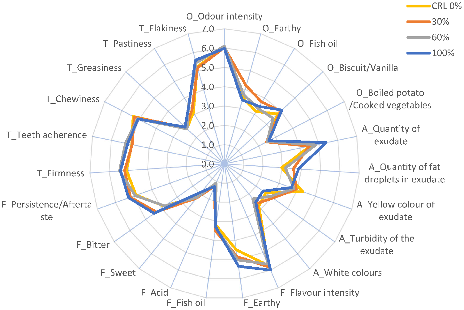 Changes in fish feed ingredients can affect the appearance, smell and aroma of fish fillets [51]. This could in turn affect the perceived quality of the fillet and consequently consumer acceptance. The sensory analysis performed in this study on the intensity data of sensory attributes to estimate the sample effect (CRL 0, 30, 60 and 100 percent; Fig. 1) found no significant differences (p ≤ 0.05) in any case, in agreement with other studies. The lack of statistical differences in this study is probably related to the presence of other notably intense attributes such as earthiness, which could have masked the possible effect of diet on sensory characteristics.