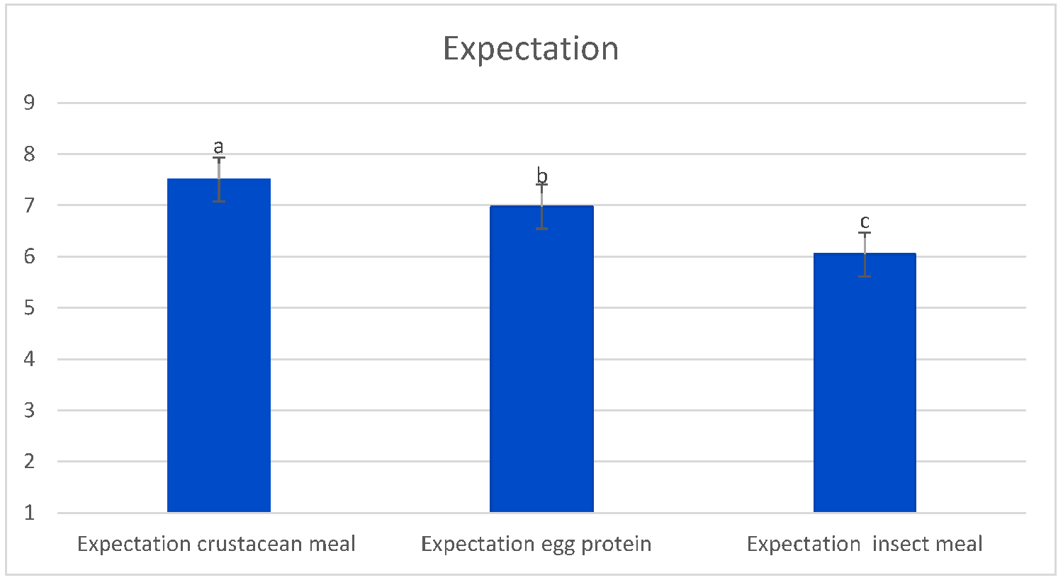 Even motivated consumers still hesitate to regularly consume insect-based foods due to other practical and socio-cultural barriers. Our results are in line with the findings of other studies reporting that the expectation towards insect meal was punctuated with a lower value compared to crustacean and egg protein (Fig. 2). The decrease in expectations indicates a worse global perception of insect meal, most likely because it is a product with which participants are unfamiliar compared to crustaceans or eggs. In any case, it should be noted that the mean value obtained was above the central point of the scale (5), indicating that it was not rejected.