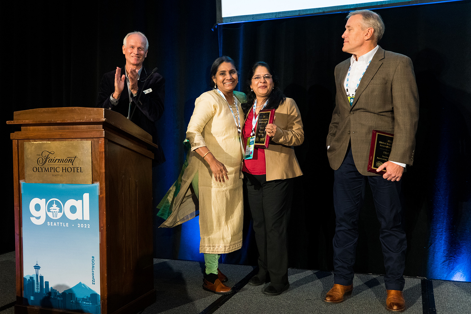 Cruz Foam, a California-based company turning chitin from shrimp shells into a biodegradable foam that serves as an alternative to polystyrene for shipping packaging, was the overwhelming winner of the GFIA. Aristogene Biosciences, a company in India with two products for shrimp farmers that can replace antibiotics, won the GAIA in a close race. Both winners were determined by audience vote.