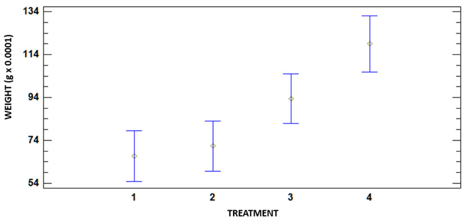 The multivariate analysis of variance for PL weights between treatments and replicates showed no statistical differences between the replicas for each treatment (P> 0.05) but did show differences between treatments (P < 0.00001). The interaction was also not significant between main effects (P> 0.05).
