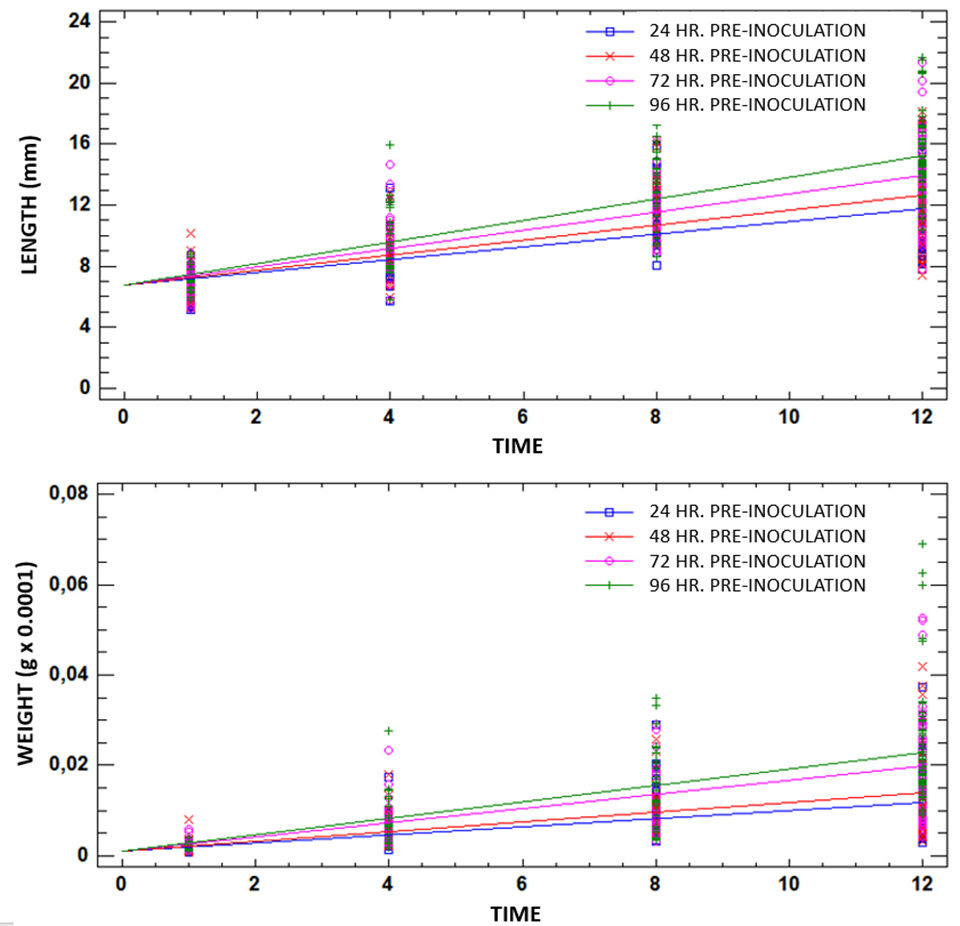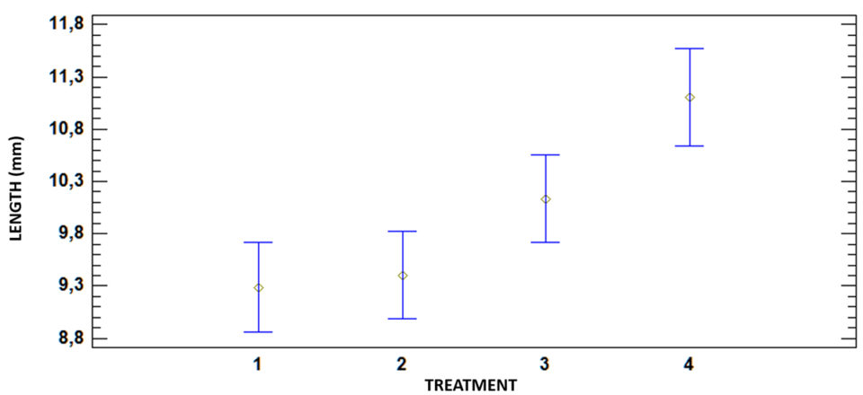 As with the weight factor, the Multiple Ranges Test (Fisher’s LSD) showed that there are no differences in PL length between treatments 1 (24 hours of inoculation) and 2 (48 hours of inoculation); but there were differences between the first two and treatments 3 (72 hours of inoculation) and 4 (96 hours of inoculation). In order of better results: Treatment 4 > Treatment 3 > Treatment 2 = Treatment 1).