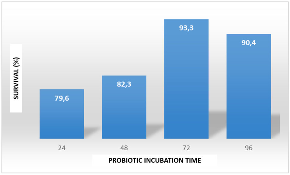 Regarding the growth rate in size and weight, the comparison by analysis of variance of the slopes of the regressions adjusted to the linear model revealed that with the treatment of 96 hours of pre-inoculation, the highest slope was obtained in relation to the control group, which demonstrated higher growth rate in this treatment (Fig. 4). Fig. 5 shows the survival percentage of the PL in each treatment.