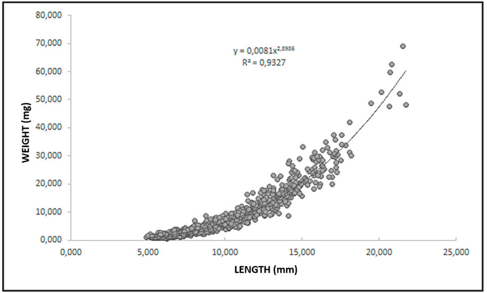 An interesting aspect in our study was the possibility of establishing the length-weight relationship from individual data of the PL to obtain a regression equation adjusted to the potential model. With this equation, the individual weight of each larva can be estimated from its length, and thus yields a more precise estimate of the PL biomass in the system. With a more accurate biomass estimate, it is possible to adjust the food rations to more adequate percentages.