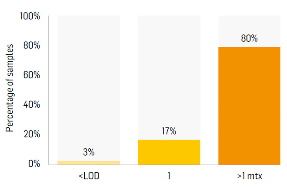 An important factor that also negatively affects aquaculture species is the co-occurrence of mycotoxins; the simultaneous presence of more than one mycotoxin in the same sample. 80 percent of finished feed samples collected in 2017 were contaminated by more than one mycotoxin (Fig. 2).