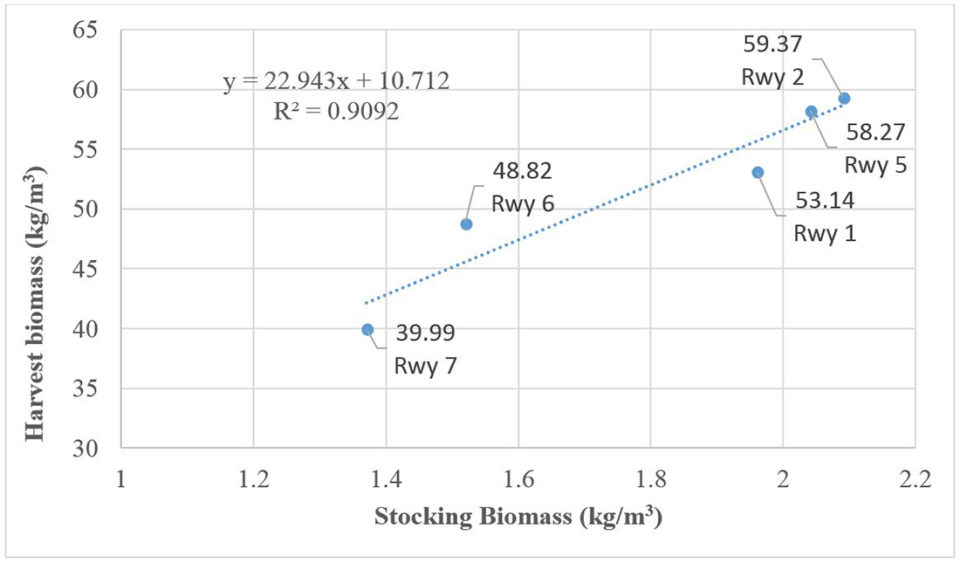 La relación entre el peso de siembra y cosecha en términos de biomasa (kg) por volumen (m3) para los últimos cinco raceways exhibió una relación lineal (R2 = 0,90473), lo que puede indicar el potencial de este sistema para mantener densidades mayores sin afectar el crecimiento. En estos cinco canales, la tilapia del Nilo mostró una tasa de crecimiento específica de 2.88±0.14 por ciento de ganancia/día (CV = 4.8 por ciento) (Figura 1).