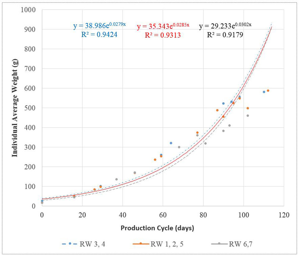 El segundo grupo de resultados incluye los raceways 1, 2, y 5. Estas celdas fueron sembradas con 17,037 ± 317 peces por raceway, con un peso promedio individual de 17,9 ± 0,8 gramos y la biomasa media en siembra de 2,03±0,06 kg/m3 de volumen de raceway. Estos raceways se cosecharon después de 116 días (raceways 1 y 2) y 132 días (raceway 5), respectivamente, con una biomasa final de 56.9±3.3 kg/m3 de raceway. La tasa de crecimiento específico promedio para este grupo fue 2.88±0.14 por ciento de ganancia/día.