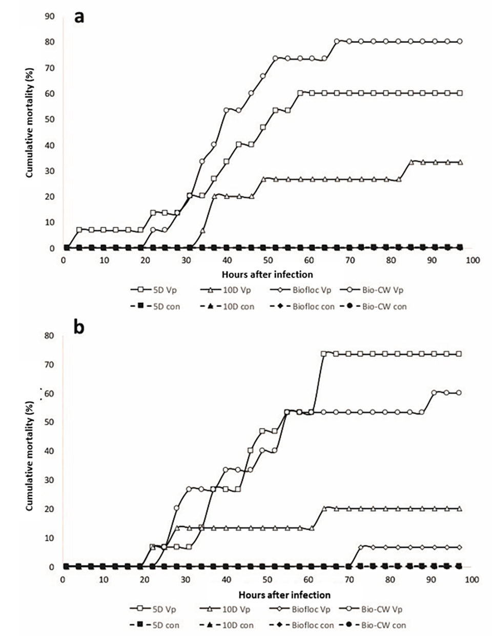 Se usaron dos dosis de VPAHPND para probar los camarones (2,11 a 2,63 × 105 UFC / ml y 2,84 a 4,54 × 105UFC / ml; n = 60 camarones por dosis) contra un grupo de control (n = 60 camarones). Las mortalidades más altas se observaron en los grupos de camarones que habían sido transferidos más recientemente desde biofloc, es decir, aquellos que se transfirieron inmediatamente de biofloc a agua y se desafiaron, y aquellos que se criaron en biofloc pero se mantuvieron durante cinco días en agua clara y luego fueron desafiados.