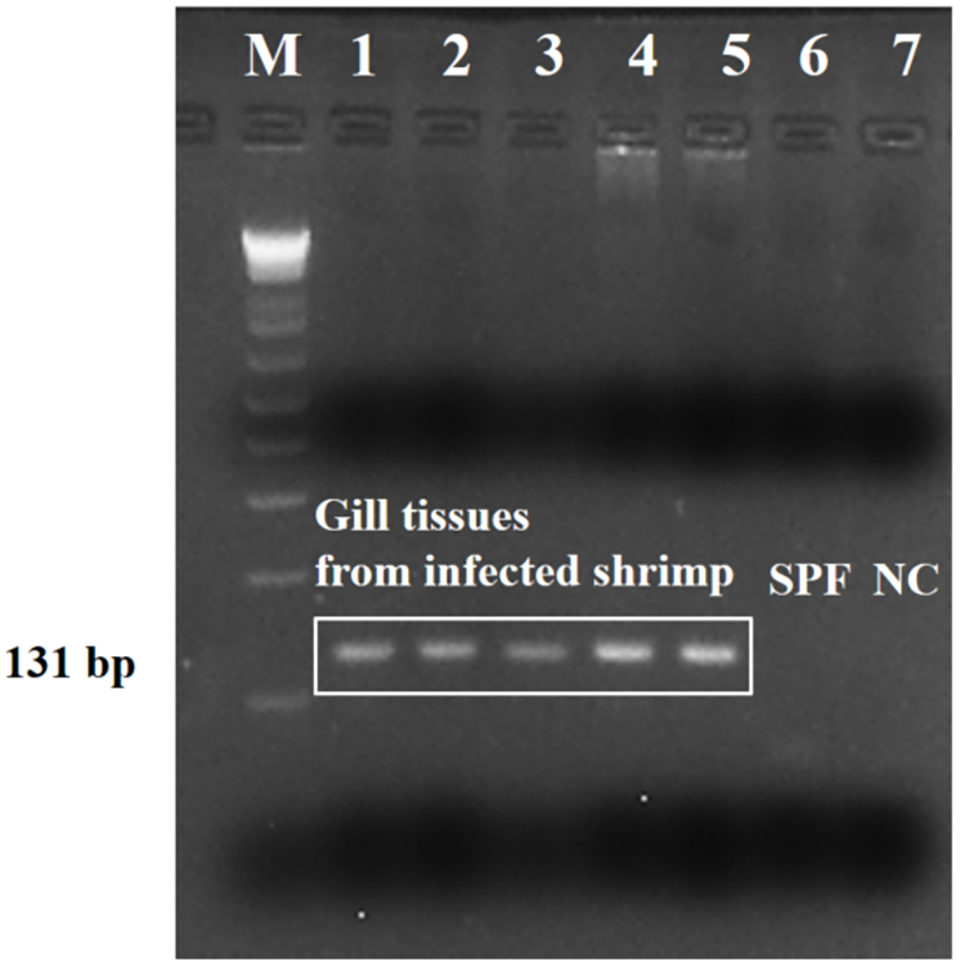 Los amplicones fuertes (un amplicón es un fragmento de ADN o ARN que es la fuente y / o el producto de los eventos de amplificación o replicación) se detectaron en el camarón analizado (cinco muestras representativas) mediante el ensayo de PCR dirigido a la secuencia del ARNr del SSU (Fig. 3). Los resultados mostraron que la secuencia de nucleótidos era 100 por ciento idéntica a las secuencias de Paramoeba sp. (Neoparamoeba sp.) de varias especies de crustáceos marinos y equinodermos. Y no hubo reacción cruzada con el ADN genómico de los camarones L. vannamei y otros camarones (P. monodon, P. indicus, L. stylirostris y M. rosenbergii), poliquetos, calamares y Artemia spp., o con otros parásitos de los camarones por la prueba de especificidad.