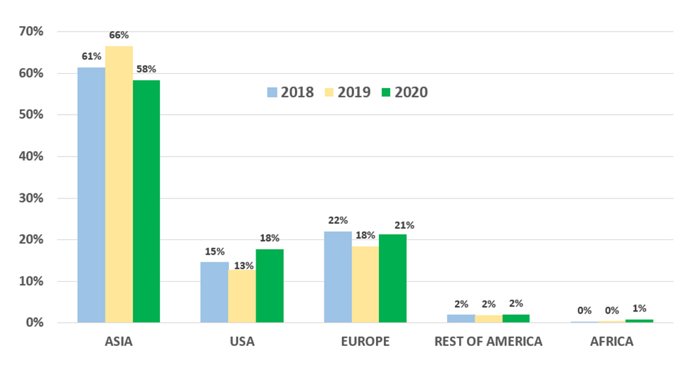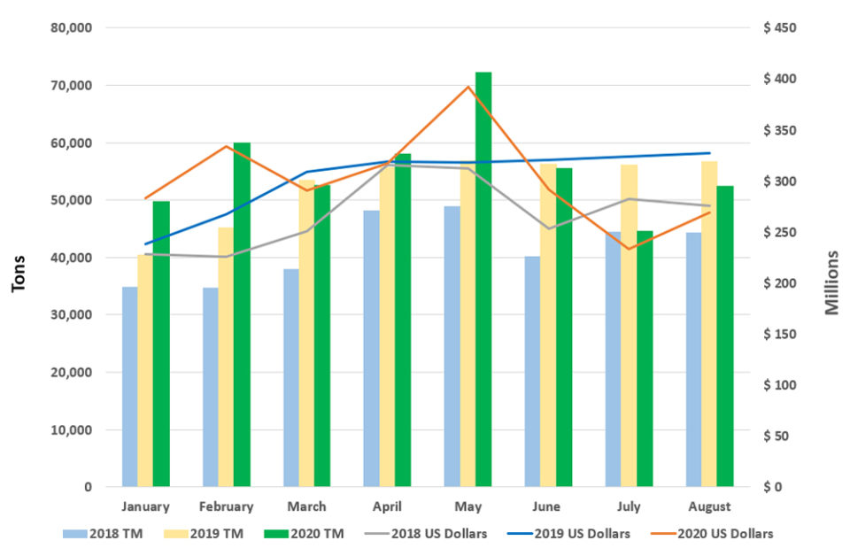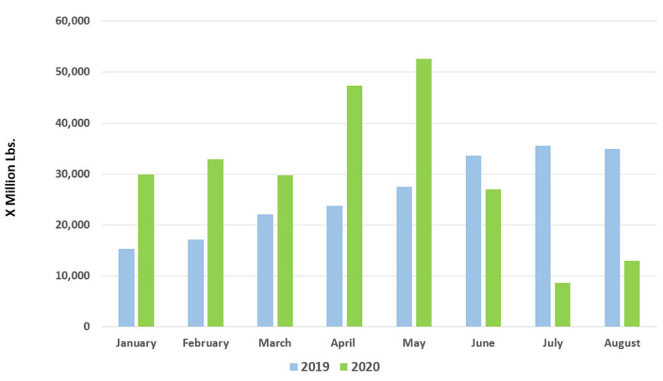For the fourh quarter of 2020, exports are expected to show growth that will allow us to close the year at 6 percent above 2019. For this to happen, we expect that Chinese consumers will begin to regain confidence in Ecuadorian shrimp in the coming months, generating orders in preparation for the Chinese New Year that will be celebrated in February next year. In turn, in the United States, shrimp orders are also being generated for the Christmas holiday season, so an increase in demand there is also expected. Regarding the European market, high levels of purchasing are not expected because, despite entering the festive season, the winter season is also expected, which is not an incentive for the consumption of shrimp in that region.