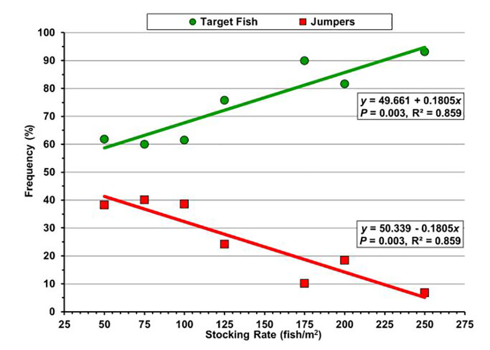 Los resultados mostraron que los índices de composición corporal eran independientes de la densidad de siembra, que en la cosecha había dos grupos distintos de peces (posiblemente una jerarquía de alimentación con peces más grandes que limitaban el comportamiento de alimentación de los más pequeños), y que las distribuciones de talla de los peces objetivo y los saltadores cambiaba significativamente hacia tallas más pequeñas con aumentos en la densidad de siembra. En respuesta al aumento de la densidad de siembra, los peces objetivo aumentaron linealmente del 62 al 93 por ciento y los saltadores disminuyeron linealmente del 38 por ciento al 7 por ciento de la población, respectivamente (Fig. 1). La densidad de siembra también afectó la estructura de la población en el momento de la cosecha, y una explicación plausible es la competencia por los alimentos o un cierto deterioro del comportamiento normal.