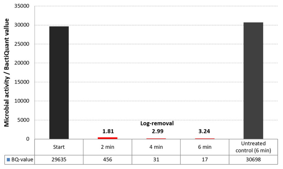 In addition, the electrochemical disinfection efficacies were evaluated by use of new microbial assays quantifying the bacterial activity in the water. The microbial activity in the water was tested on RAS water samples prior to, during and after electrochemical treatment. The degrees of bacterial inhibition were proportional to the oxidants produced at the batch experiments and showed that a 1,000-fold reduction (Log3) could be achieved within 5 minutes of electrochemical oxidation (Fig. 3).