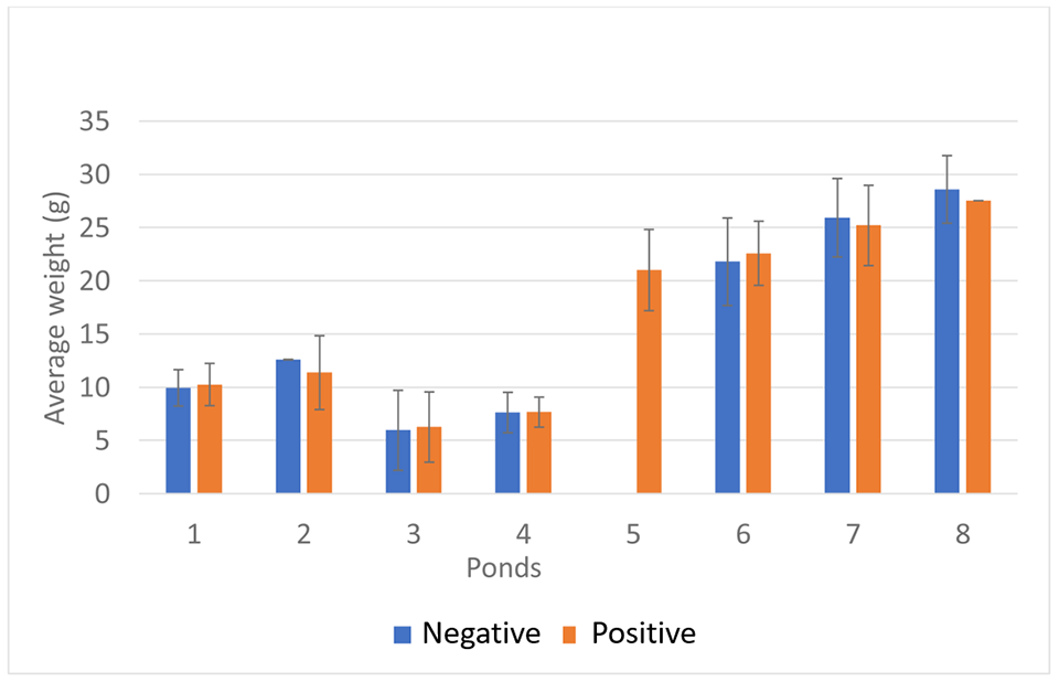 Para establecer la asociación entre el peso de los camarones y la presencia de IHHNV, la población de cada estanque se dividió en dos grupos según los resultados de la PCR en tiempo real (IHHNV positivo y IHHNV no detectado). Como se muestra en la Fig. 1, no hubo correlaciones significativas entre el peso promedio de los camarones y la presencia de IHHNV dentro del mismo estanque.