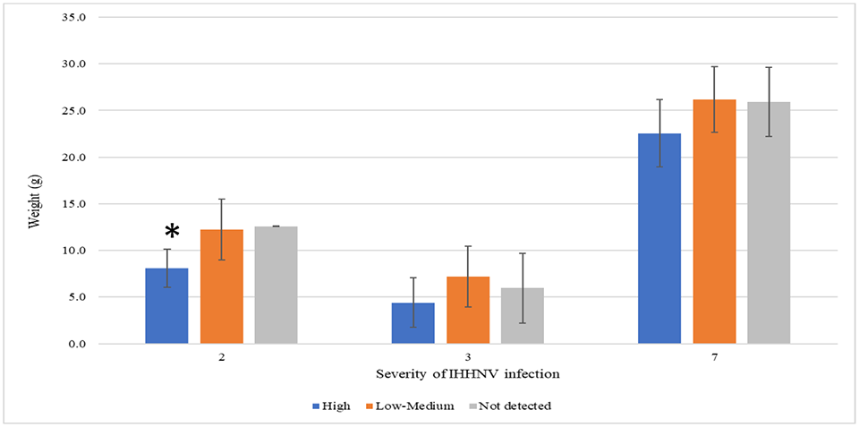 Para comprender mejor el efecto de la carga de IHHNV en el crecimiento de los camarones P. vannamei en un estanque determinado, las poblaciones de camarones se dividieron en tres categorías según el número de copias de IHHNV: no detectado, bajo a medio, y alto. Solo tres de los ocho estanques de crecimiento (estanques 2, 3 y 7) tenían camarones representativos de las tres categorías. Como se muestra en la Fig. 2, hubo una tendencia inversa entre el número de copias de IHHNV y el peso de los camarones, con animales que tenían cargas virales más altas y pesos más bajos. En un caso (estanque 2), se observó una correlación significativa. Estos estanques de engorde tenían el número medio de copias más alto de IHHNV. Un estanque de engorde (estanque 5) que también mostró un alto número medio de copias de IHHNV no se analizó debido al hecho de que el 100 por ciento de los camarones dieron positivo para IHHNV. Vale la pena señalar que no se observó RDS en los camarones recolectados de ninguno de los tres estanques o los cinco estanques restantes.