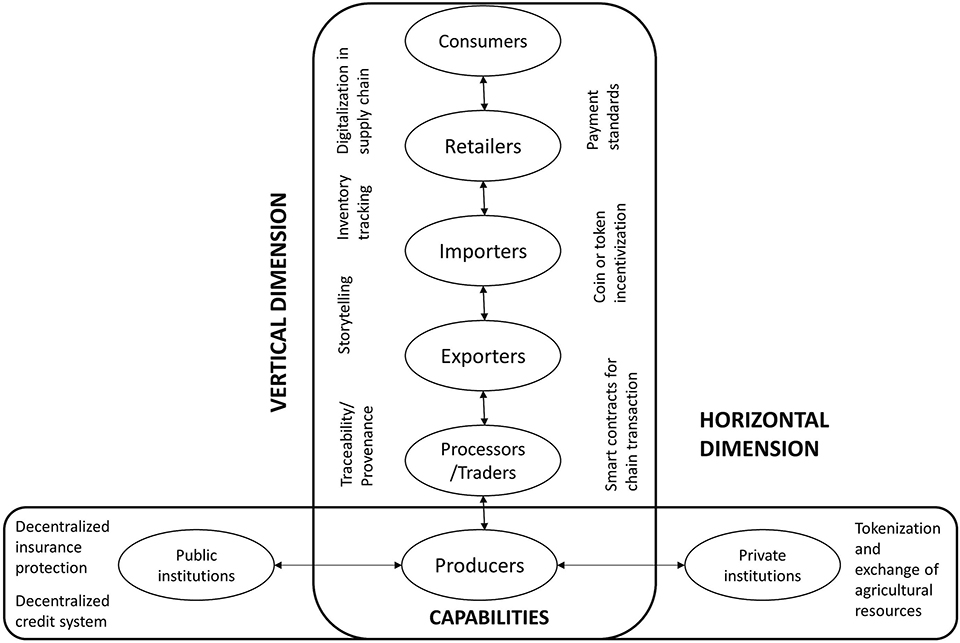 Los temas que la dimensión horizontal trata de abordar incluyen el nivel de desigualdad y el acceso al capital por parte de los productores locales para mejorar su capacidad de participar en las cadenas globales de valor. Blockchain aborda estos problemas a través de varios casos de uso. Estos incluyen blockchain para protección de seguros descentralizada para productores, financiamiento descentralizado y microcrédito para bancos y productores, y tokenización e intercambio de recursos agrícolas. La implementación de blockchain a nivel horizontal puede ayudar a los productores a cumplir con los requisitos de la dimensión vertical de la cadena de valor, tales como los estándares de sostenibilidad.