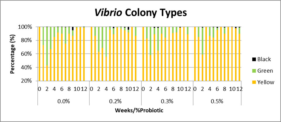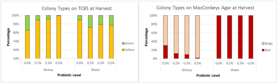 Diez camarones fueron removidos semanalmente de un tanque designado por tratamiento y se registraron los pesos. La supervivencia promedio, el peso final, el rendimiento, la tasa de crecimiento específico, la tasa de crecimiento semanal y la tasa de conversión alimenticia se evaluaron en la cosecha. Se recogió agua semanalmente de cada tanque y se sembró por triplicado en agar TCBS Vibrio selectivo.