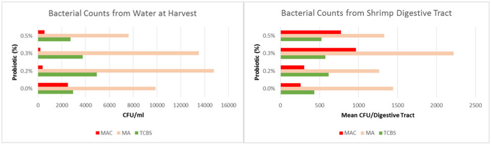 En la terminación experimental, el agua se plaqueó adicionalmente en agar marino (MA) para determinar los recuentos bacterianos totales y en placa de agar MacConkey (MAC) para determinar los recuentos de bacterias entéricas. En la cosecha, el tracto intestinal de cinco camarones de cada tanque se recolecto, se mezcló, se maceró y se sembró en placas TCBS, MA y MAC.