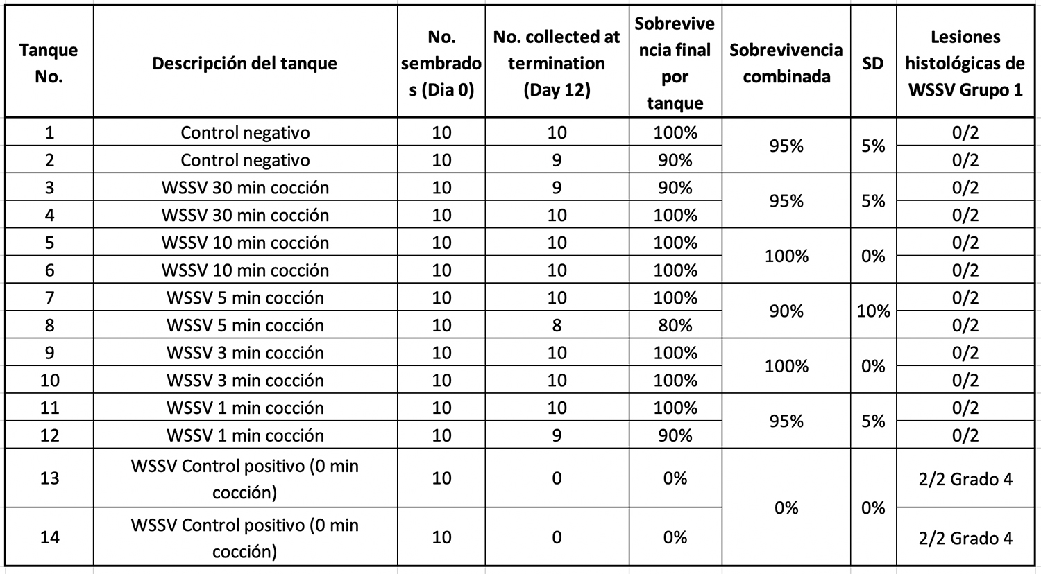 | Desafío de camarones SPF con camarones infectados con WSSV cocinados durante 30 minutos | Desafío SPF con camarones WSSV con 30 min cocción | 0/4 | ND |