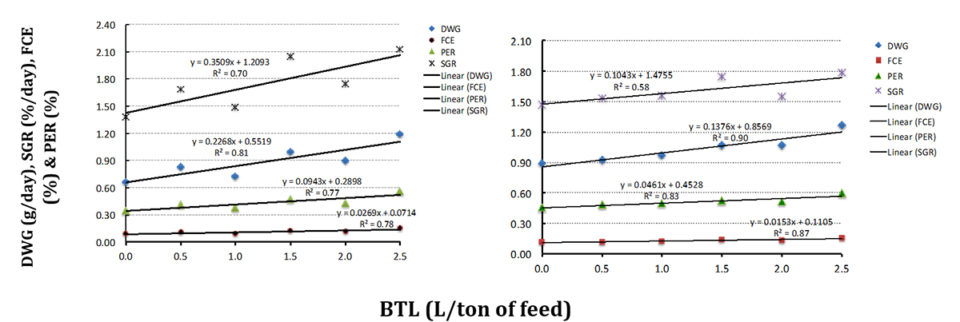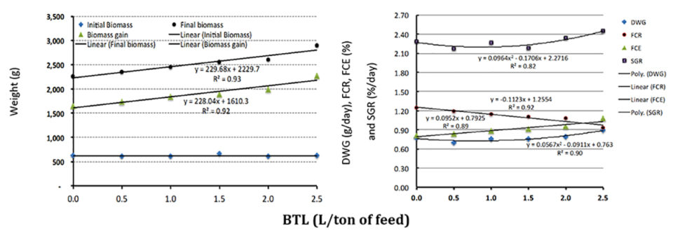 During the first 10 weeks of the feeding trial, tilapia survival remained at 75 percent or higher and did not differ with BTL dose, indicating that the culture conditions and health of the fish remained within the comfort zone when BTL was applied at up to 2.5 L per ton of feed. However, linear increments in biomass and feed conversion efficiency, and also a linear decrease in FCR values also indicate that BTL addition promoted good responses in growth and feed utilization, and that further increases in the dose of BTL may increase these performance parameters up to a certain level.