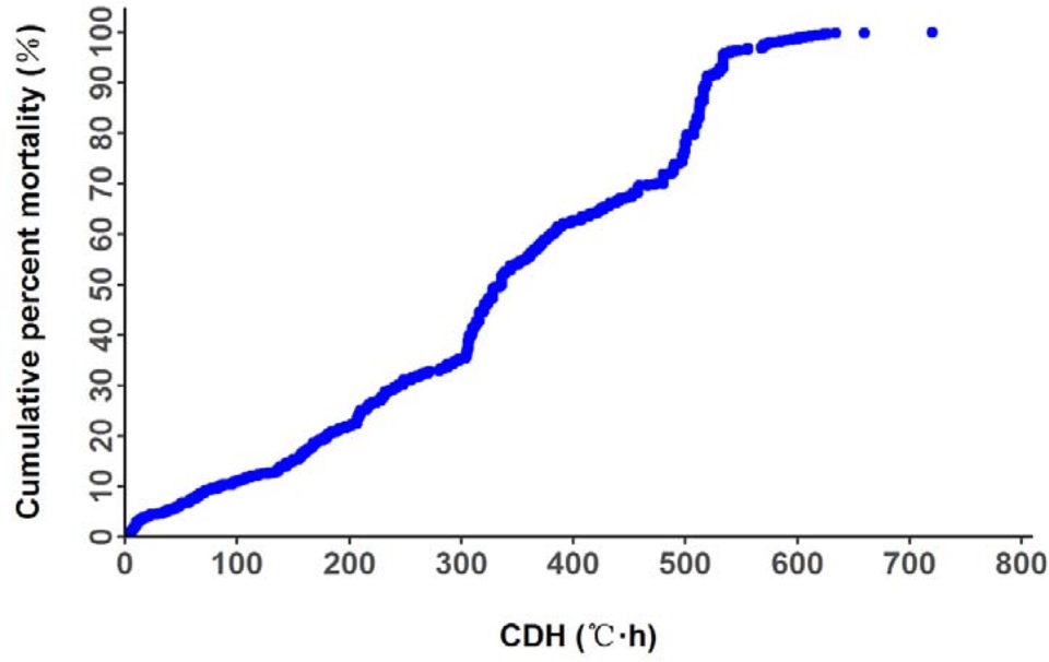 In the cold tolerance challenge experiment, mortality of shrimp was observed when water temperature was 13.9 degrees-C and the CDH was 0.800 degrees-C*h. All the shrimps had died by the time the CDH reached 720 degrees-C*h (Fig 1). The cumulative mortality curve is shown in Fig 1.