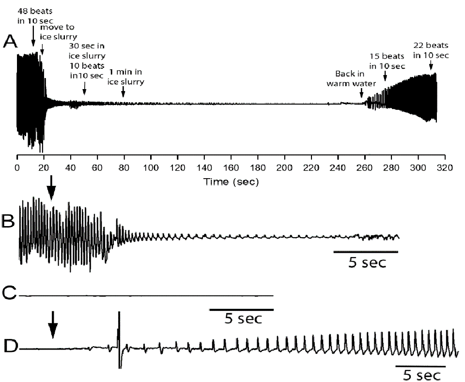 The ECG of 24-gram shrimps showed that before exposure to cold, pinching of the tail resulted in an increased heartbeat. Upon immersion in ice slurry, the heartbeat started decreasing immediately. After 5 to 30 seconds of immersion, pinching did not affect the heartbeat anymore and ultimately the heartbeat stopped. After a few minutes of immersion in an ice slurry, the heart rate of the shrimps placed back into warm water returned to normal status (Fig. 1.) Furthermore, it was also demonstrated that the violent tail flicking that occurs typically after 45 seconds to 1 minute of immersion, is likely to be an involuntary movement since the same response is seen in the absence of a heartbeat and even when the central ganglia are removed from the animal.