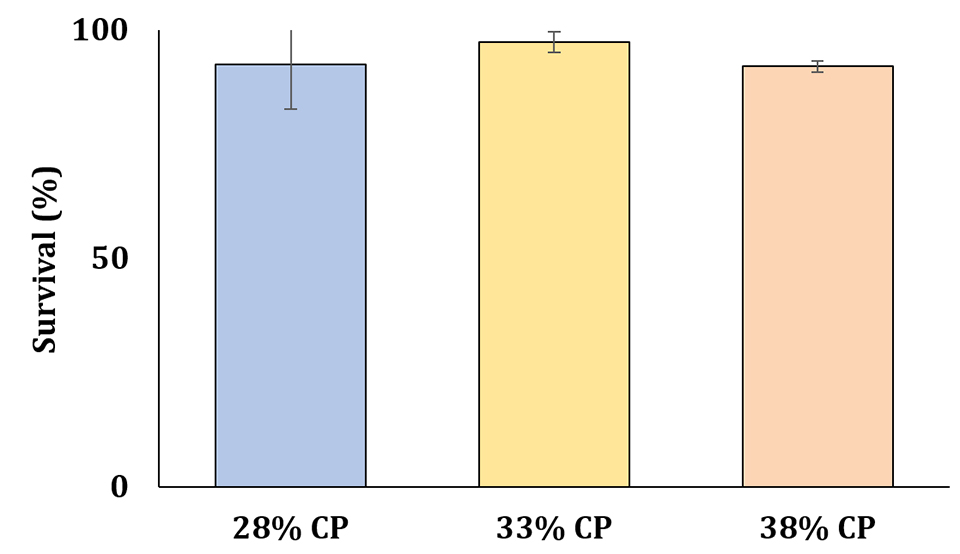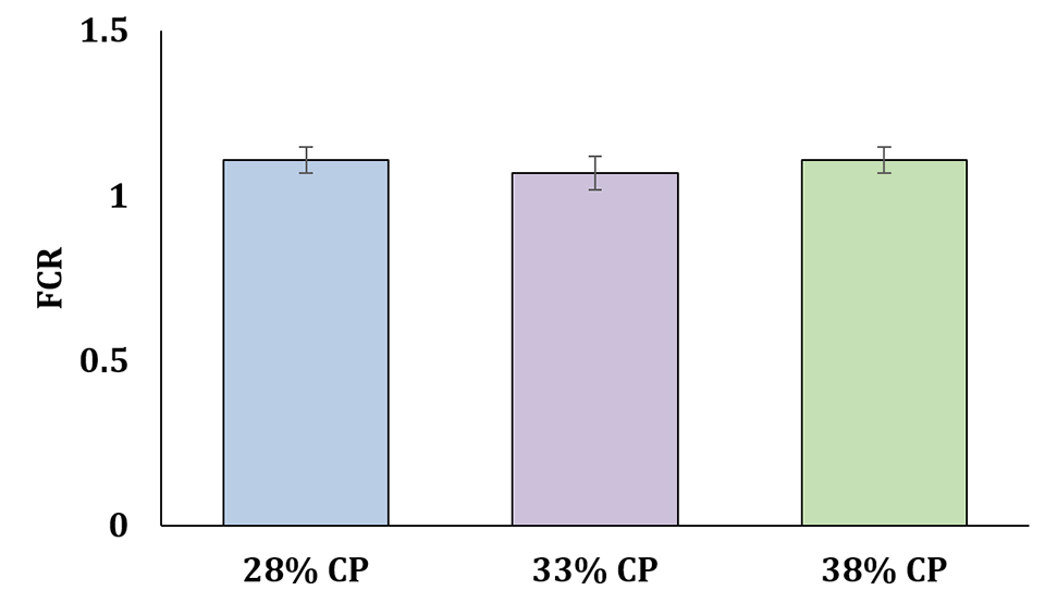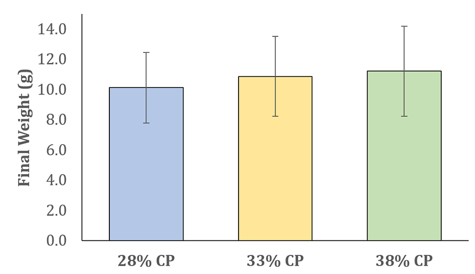 We used three different diets with different protein levels (28, 33 and 38 percent crude protein, CP). All diets included 50 percent fishmeal analog (FMA) and 50 percent conventional fishmeal in their protein content (Table 2).