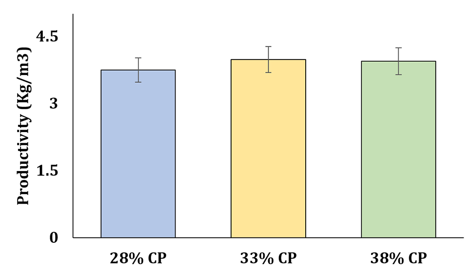 In recent years, several researches have reported shrimp production in super-intensive BFT systems ranging from 5 to 10 kg per cubic meter. However, commercial-scale producers typically report yields in super-intensive systems ranging from 2 to 5 kg per cubic meter. In our study, we were able to achieve production levels ranging from 3.5 to 4.5 kg per cubic meter (Fig. 3) while using experimental diets that included only 50 percent of the conventional fishmeal levels normally used.