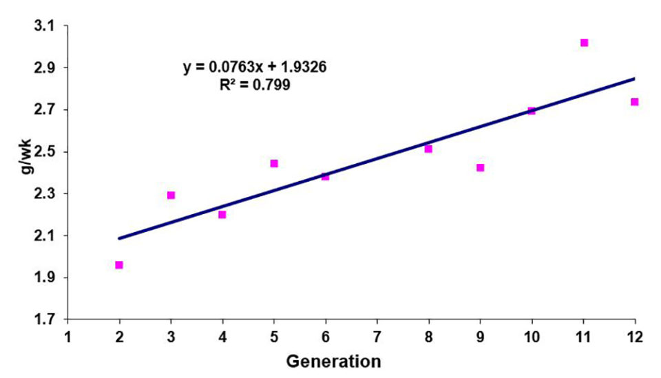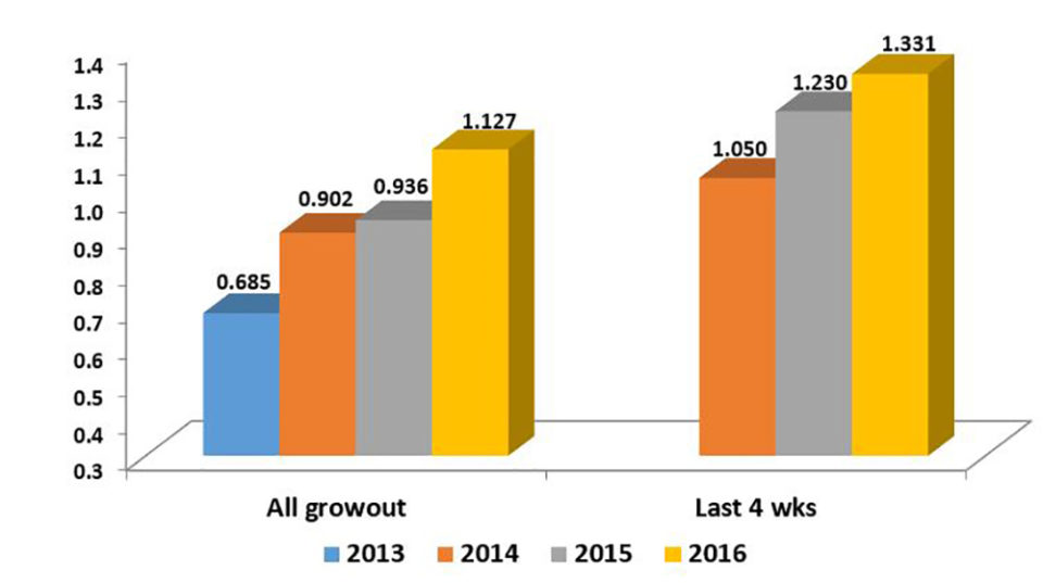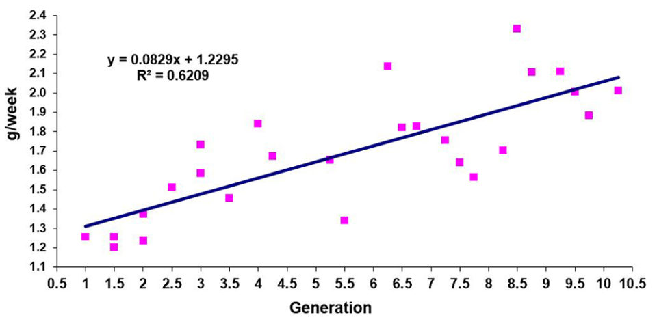 Actualmente estamos gestionando ocho programas de mejoramiento genético en siete países diferentes, uno de estos programas ya por 14 años y el más reciente por poco más de un año. Las mejoras en el crecimiento han sido constantes en todos los programas, con tasas anuales entre 5 y 12 por ciento.
