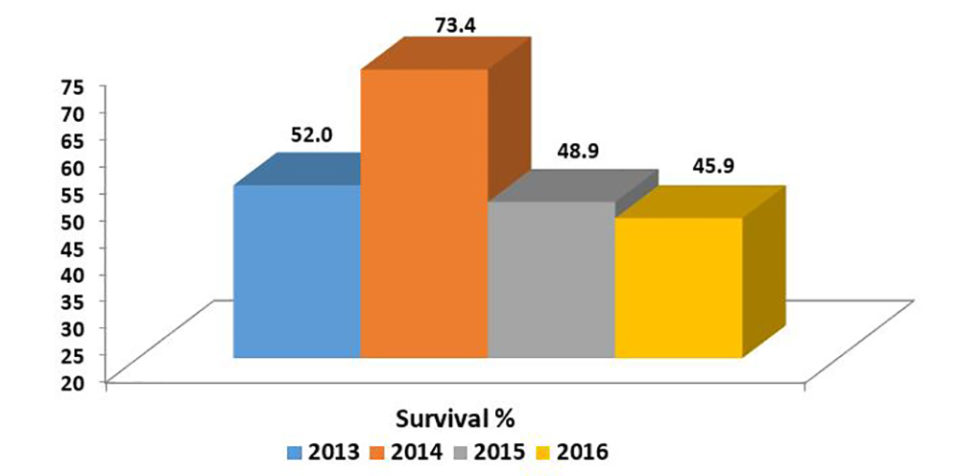 Las mejoras en las tasas de supervivencia han sido menos predecibles y menos consistentes que las mejoras en las tasas de crecimiento. En general, la evolución de las tasas de supervivencia ha sido positiva, pero moderada y a menudo con fluctuaciones que no se registran en la evolución más lineal, predecible y constante de las tasas de crecimiento. En otros casos, las tasas de supervivencia se han mantenido bastante estables a lo largo de los años sin mayores mejoras.