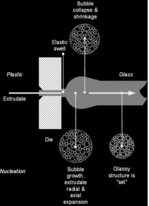 In the final zone, the molten materials become a plastic-like, amorphous melt, and here is where the highest pressures and temperatures are achieved. The screw elements have even shallower channels and pump out the molten phase through the die. Upon exiting the die, the melt is suddenly exposed to the atmospheric pressure, causing a drop in pressure that changes the superheated water into vapor, and resulting in what is known as expansion (Fig. 2).