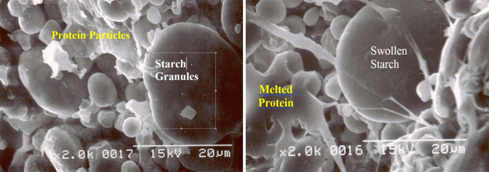During the extrusion process, proteins will form a disperse phase within the starch matrix. Under the effect of high shear and temperature, some proteins – in particular the water-soluble ones like albumins – will denature and coagulate. However, due to the shearing action of the screws, the protein is macerated into very small pieces.