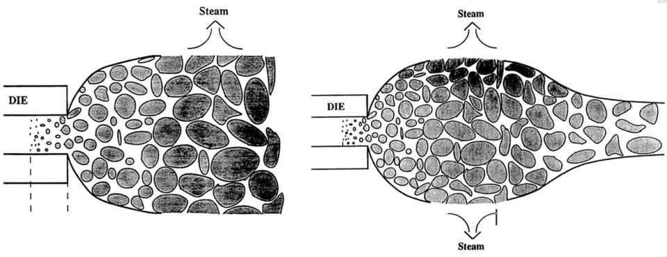 Extrusion cooking involves the application of mechanical energy supplied by the shearing and mixing action of the extruder screws. During the process, a formula mix is transformed from a powdery, free-flowing meal into a dense, compact powder. As temperature and pressure increase in the last section of the extruder, the powder phase melts to form what is known as the fluid melt phase. In the last section of the extruder, the water contained in the melt is superheated and in the liquid phase.