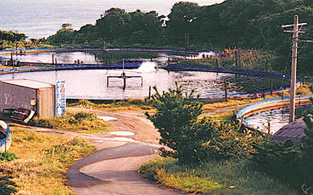 In 1973, the new farm of Mitsui Norin Marine Co. Ltd. was established on the southern tip of mainland Japan. It used 14 round, double-bottomed tanks built after Shigueno’s design. He knew from previous experience that this system was more productive than the conventional pond system, although the initial cost is higher (Fig. 1). The merits of this system, including easier water exchange, draining of sludge, and maintenance of the aerobic sand bed filter, contributed to the increased production.
