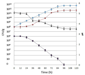 Acidification must be achieved as quickly as possible, to inhibit the growth of pathogenic and spoilage microorganisms in the substrate and increase the shelf life of the resulting fermented substrate. Moreover, considering that no sterilization procedures were done, the quick drop in pH was found to be necessary for maintaining microbial hygiene and for retaining the quality of the product as an aquaculture feed. In fact, the amount of initial substrate total coliforms was 106 CFU/gram, but no fecal coliforms were detected. The microbiological analysis for total coliform determination showed a net decrease during the fermentation, to reach a complete absence after 96 hours (Fig. 1).