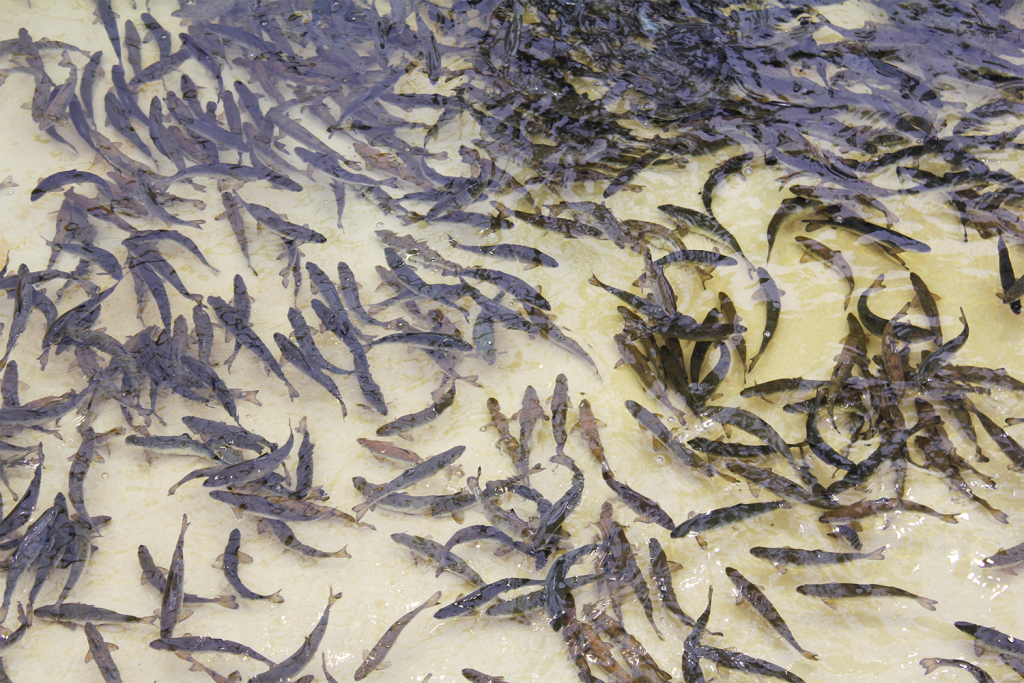 Approximately 6,000 fish were distributed into each sea cage, using sensors that detect and record fish data before releasing them into each cage. The fish were randomly distributed into nine open sea cages. Diets were assigned to the sea cages in triplicates using a randomized block design, containing three blocks to account for cage position effects. The fish were acclimatized to the control diet one week prior to the start of the experiment. The feed was dispersed using automatic surface feeders with meals given every three minutes during seven hours a day (20 doses per hour).