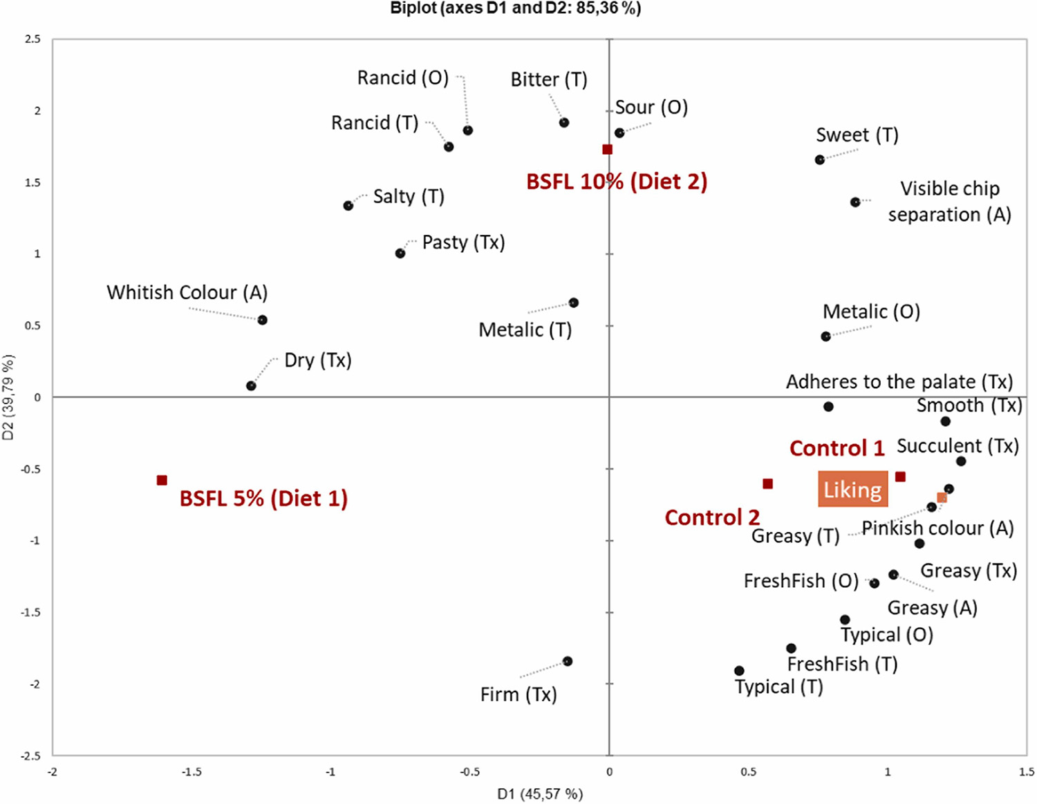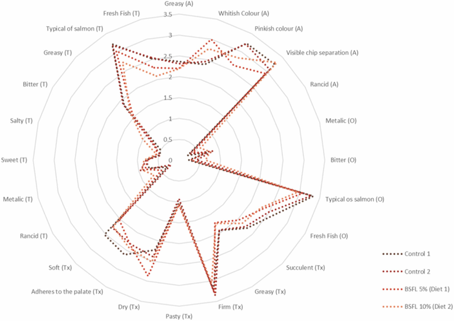 The sensory testing conducted on salmon fillets did not detect any significant differences between the control and BSFL-based diets. Similar results were obtained in studies by other researchers involving trained and non-trained panelists in Atlantic salmon where partial or total replacement of dietary FM with BSFL did not impair the physico-chemical quality of the fillet.
